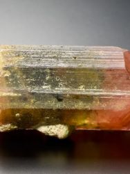 This is a deep yellow-pink, lustorus and terminated liddicoatite crystal. Tourmaline is what Malkhan is famous for, and in my opinion, the polychromes and the purple-pinks represent the finest examples of this material. This is a phenomenal quality for the locality where you do not usually see such gemminess nor such lustre on the crystals with extremely well-bevelled terminations.