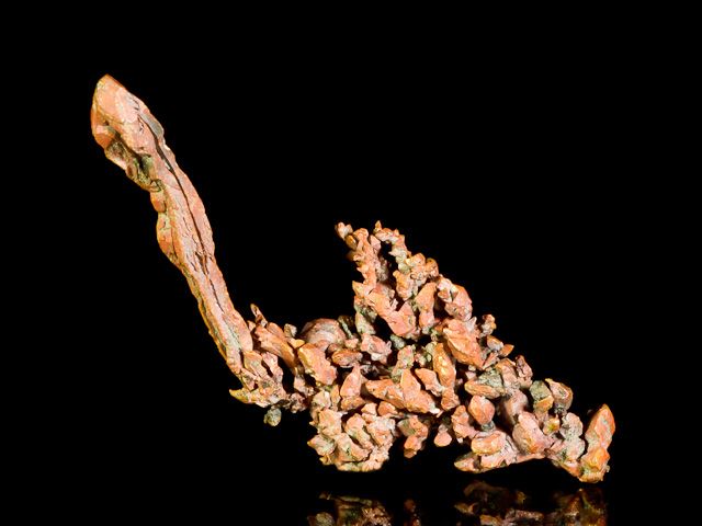The excellent specimen is very esthetic due to the large size of the main crystal, which is partially skeletal with very well defined faces and edges on an arborescent growth of small Cooper crystals.