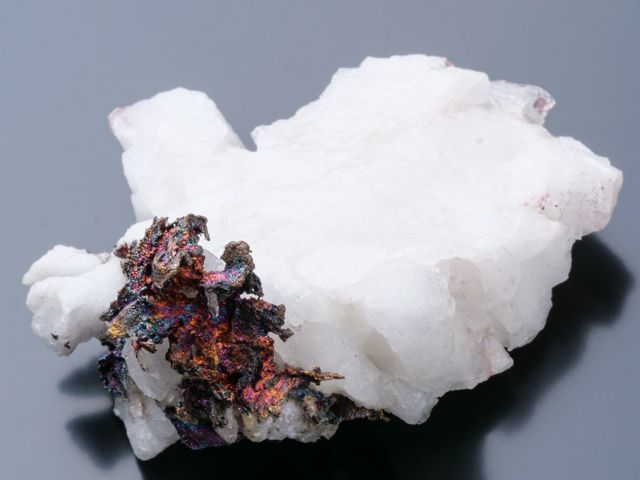 Hezký vzorek měďi se zlatem a stříbrem resp. elektra na křemeni z nového nálezu na lokalitě Aouint Ighoman v Maroku.Hezký vzorek měďi se zlatem a stříbrem resp. elektra na křemeni z nového nálezu na lokalitě Aouint Ighoman v Maroku. Seskupení lesklých krystalů kovu dosahuje velikosti až 13 mm a vystupuje z bílé podložky křemene na jedné straně.