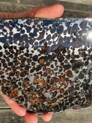 169 g slice of Pallasite Meteorite (Stony-Iron) with beautiful transparent olivine crystals densely packed throughout the piece within the nickel-iron matric.169 g slice of Pallasite Meteorite (Stony-Iron) with beautiful transparent olivine crystals densely packed throughout the piece within the nickel-iron matric. The slice has been coated with a resin to protect from rust so it will look amazing forever. These slices always look stunning in natural sunlight.