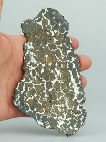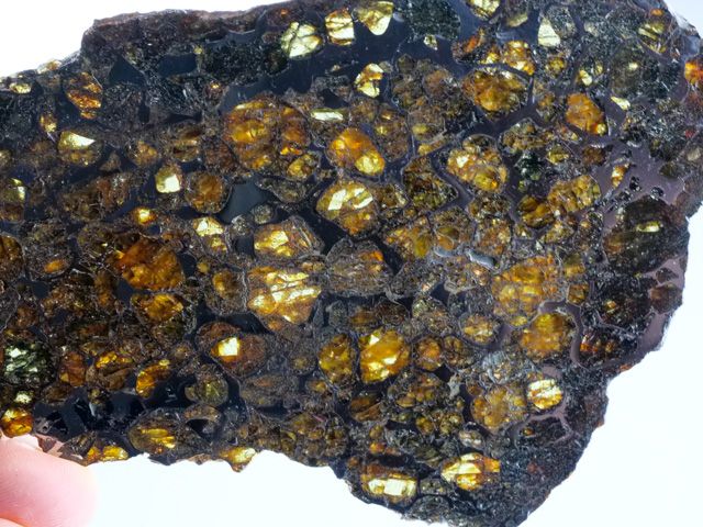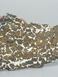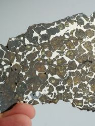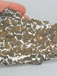 This is a slice of the Seymchan Pallasite Meteorite, it weighs 84.7 grams.This is a slice of the Seymchan Pallasite Meteorite, it weighs 84.7 grams. Seymchan was found in Magadan district, Russia in 1967. This piece measure about 13,8x8,3x0,26 cm.