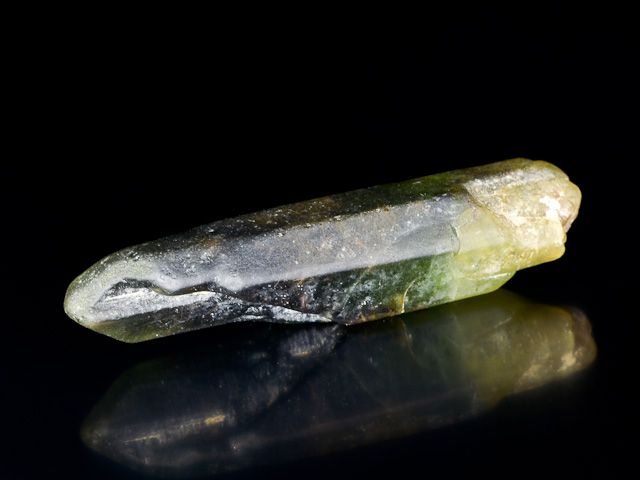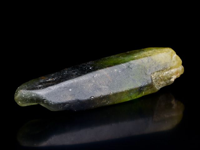 Ukončený krystal olivínu (peridot). Jedná se o drahokamovou varietu přechodového členu minerální řady olivínu forsterit - fayalit. Krystal obsahuje inkluze vzácného ludwigitu (drobné tmavé jehličky).