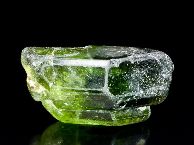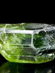 Ukončený dvojkrystal olivínu (peridot). Jedná se o drahokamovou varietu přechodového členu minerální řady olivínu forsterit - fayalit. Vzorek obsahuje inkluze vzácného ludwigitu (drobné tmavé jehličky). Nepoškozený krystal brousitelné kvality.