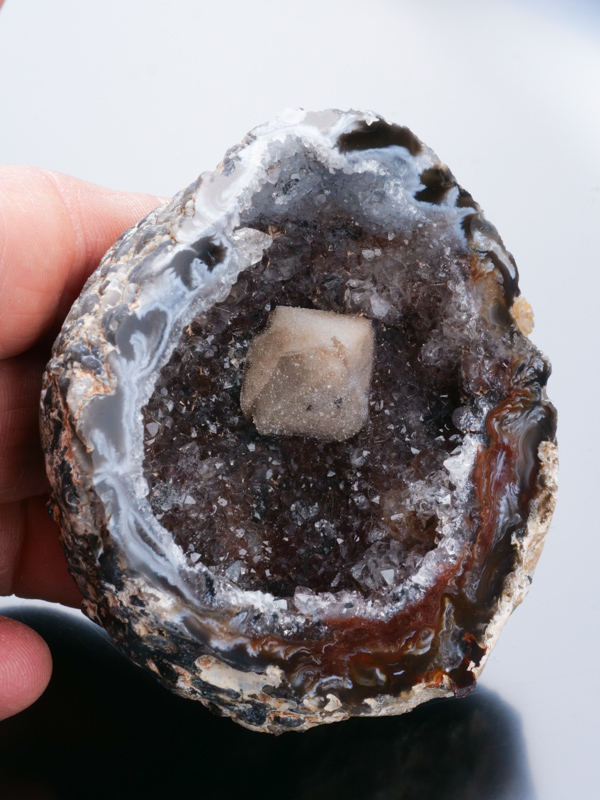 Peříčkový achát z Brazílie. Leštěné či jinak upravené kameny nenabízíme příliš často. Zde nás přesvědčila nejen krása a kvalita vzorku (na peříčkový achát je velikost nadprůměrná), ale především přítomnost kalcitovokřemenné pseudomorfózy uvnitř geody.