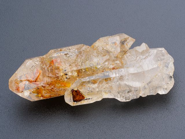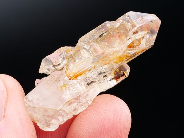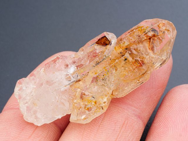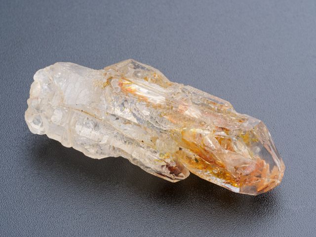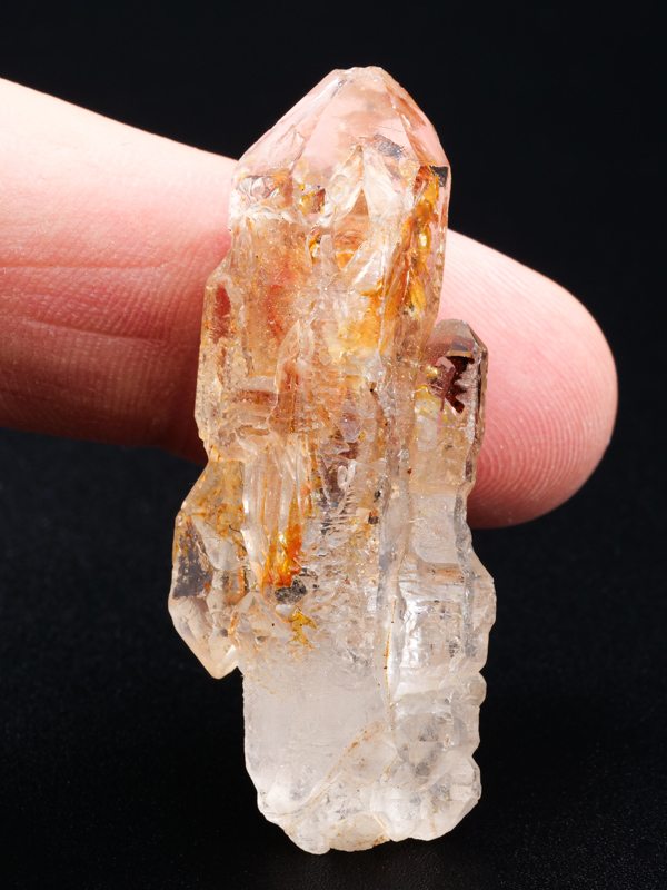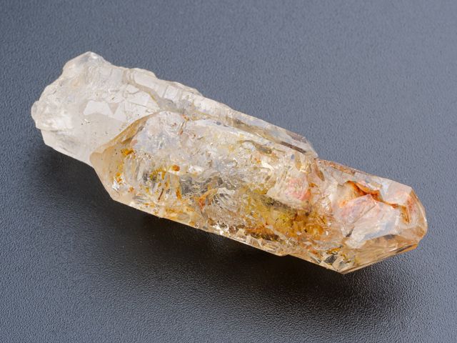 Krystal ukončeného křišťálu - částečně žezlovitého, s pěknou vnitřní strukturou a inkluzemi čistého ropného oleje.Krystal ukončeného křišťálu - částečně žezlovitého, s pěknou vnitřní strukturou a inkluzemi čistého ropného oleje. Vzorek má příjemnou barvu a opravdu vysoký lesk. Inkluze krásně svítí při UV osvětlení. Velmi drobné setření hrany ukončení (2x1,5 mm).