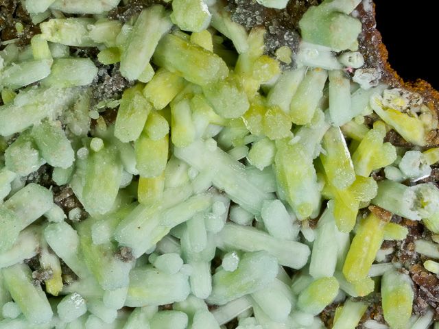 The sparkling brown matrix on this specimen provides a dramatic, high contrast backdrop for a host of tapered pyromorphite crystals, almost all of which have pseudomorphed to plumbogummite.The sparkling brown matrix on this specimen provides a dramatic, high contrast backdrop for a host of tapered pyromorphite crystals, almost all of which have pseudomorphed to plumbogummite. Some are fully converted, while others show partial or no change (these are colored the usual light green for pyromorphite. This is an exciting new find from China. The largest crystals are 10 mm.