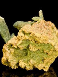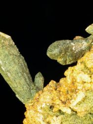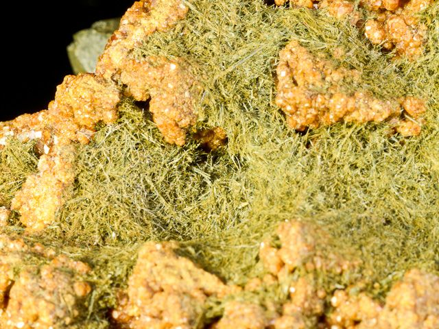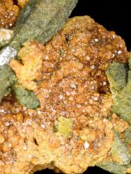 Velmi zajímavý a estetický vzorek prasemu na oranžových krystalech andraditu. Na krystaly andraditu o velikosti do 2,5 mm nasedá několik ukončených krystalů zeleného křemene (prasemu) o velikosti do 5,0 cm. Na zadní straně vzorku jsou nejspíše drobné vláknité krystaly hedenbergitu.