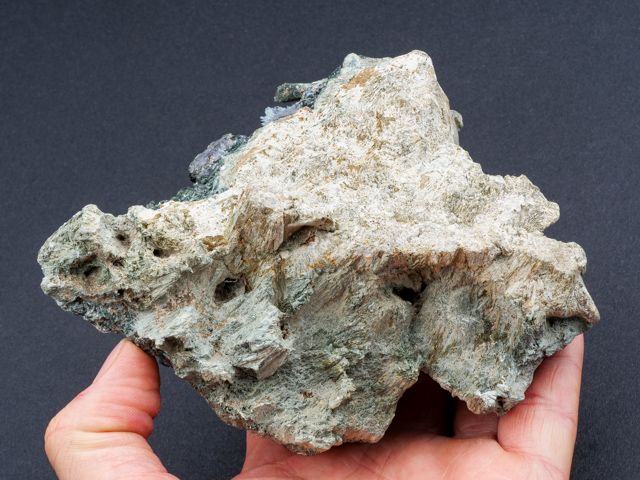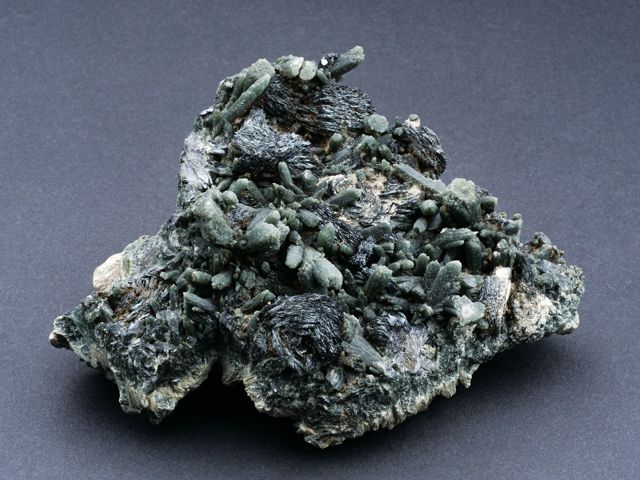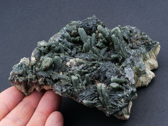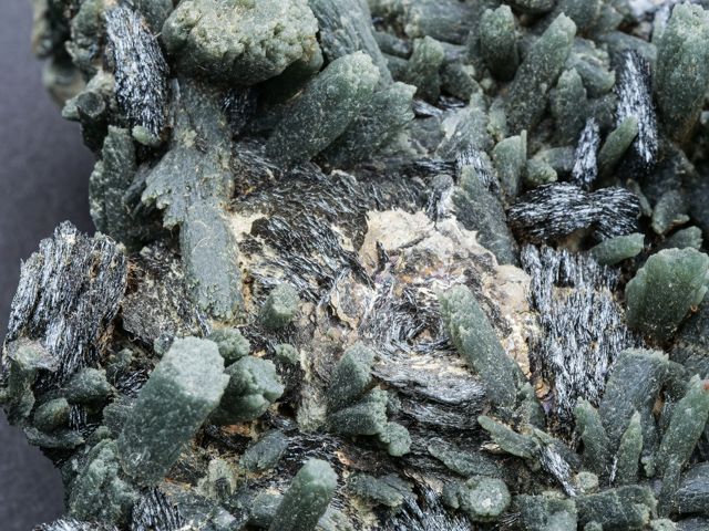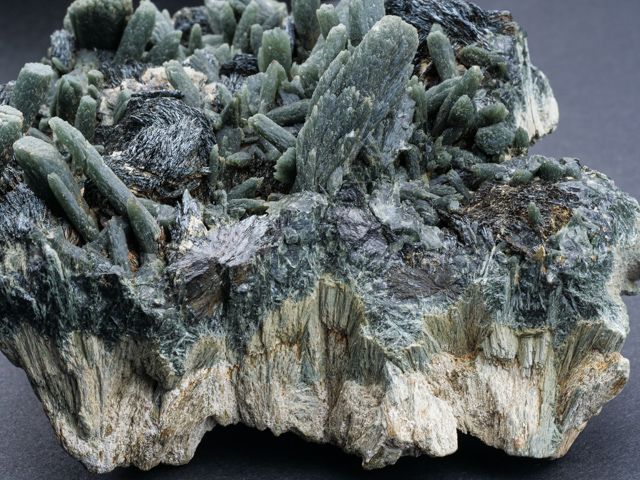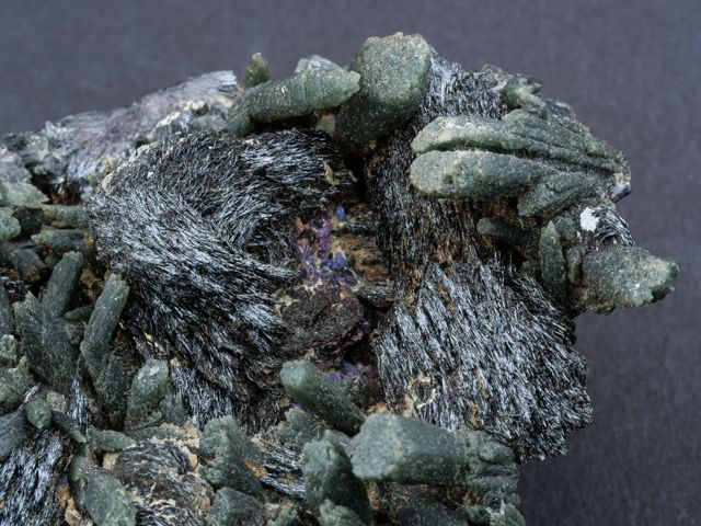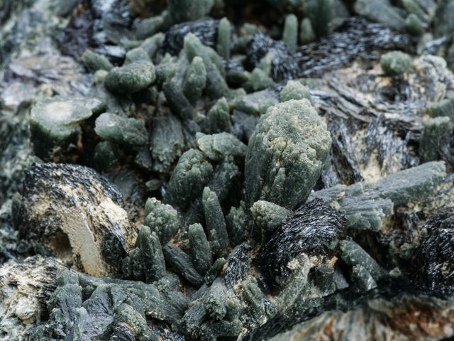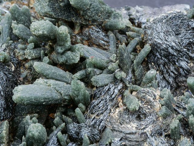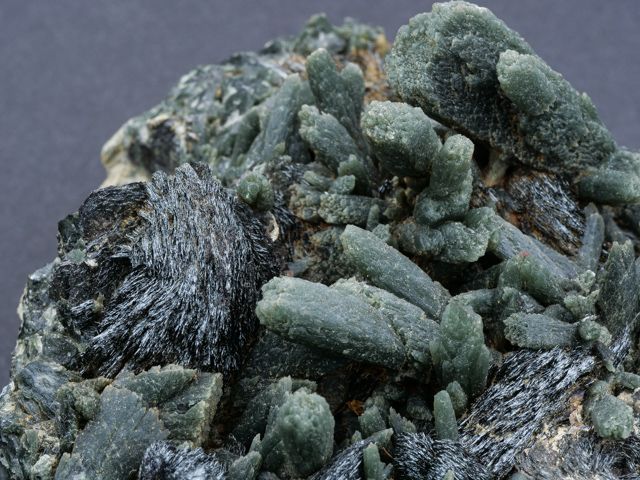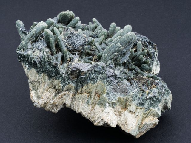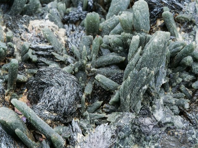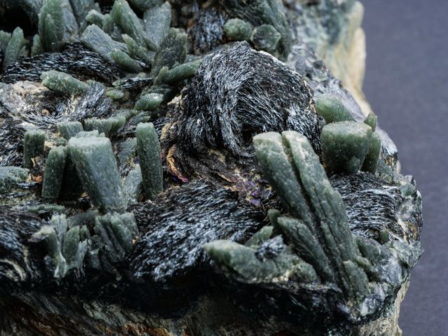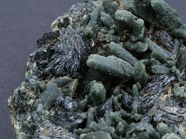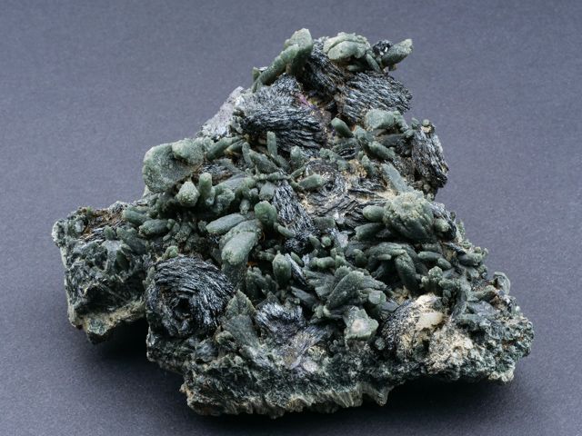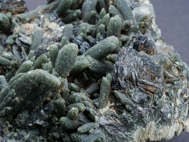 Mineralogická ukázka krystalů zeleně zbarvené odrůdy křemene, takzvaného prasemu.Mineralogická ukázka krystalů zeleně zbarvené odrůdy křemene, takzvaného prasemu. Vzorek pochází z lokality Avissalos na řeckém ostrově Serifos. Prasem na vzorku vytváří úzké protáhlé krystaly až 2,8 cm dlouhé. Krystalové plošky jsou matné a prasem je pouze průsvitný. Zbarvení je nazelenalé, při spodku spíše šedo-zelené. Co ale dělá vzorek zajímavým jsou vzácné hematitové růže narůstající na celé pohledové straně. Nějvětší hematitový útvar měří cca 2,5 cm. Kupodivu vzorek nenese známky poškození.