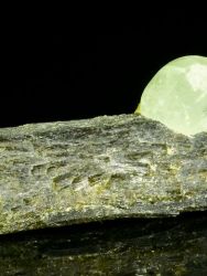 Drobná drúza kulovitého prehnitu s tmavým a oboustranně ukončeným krystalem epidotu.Drobná drúza kulovitého prehnitu světle zelené barvy společně s tmavým a oboustranně ukončeným krystalem epidotu. Jedná se o zajímavý sbírkový materiál.