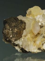 Hezká srostlice z ruského Dalněgorsku na níž dominuje 4,2 cm velký krystal pyrhotinu.Hezká srostlice z ruského Dalněgorsku na níž dominuje 4,2 cm velký krystal pyrhotinu a krystal růžového mangano kalcitu o velikosti 2,1 cm. Dále se na vzorku objevují dva typy kalcitů a drobné krystaly křišťálů do 2,3 cm.