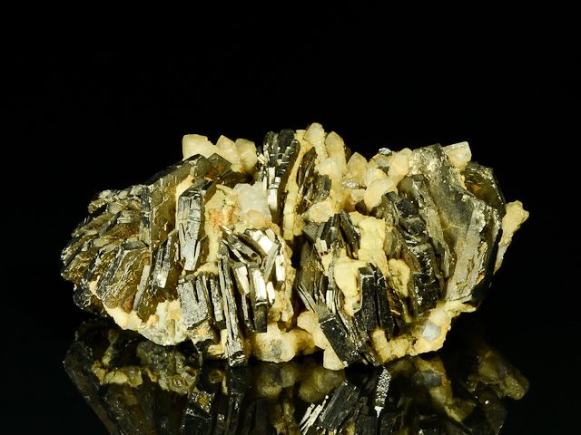 Tabular hexagonal bronze-colored metallic pyrrhotite crystals to 25 mm with lustrous quartz crystals to 15 mm scattered throughout.Tabular hexagonal bronze-colored metallic pyrrhotite crystals to 25 mm with lustrous quartz crystals to 15 mm scattered throughout. The pyrrhotite crystals are complete around all sides and the specimen can be displayed from several angles. Though the crystals are clean and in good condition, a few show damage upon close inspection, but they are minor compared to the relative size of the specimen.