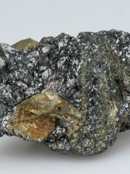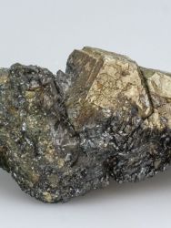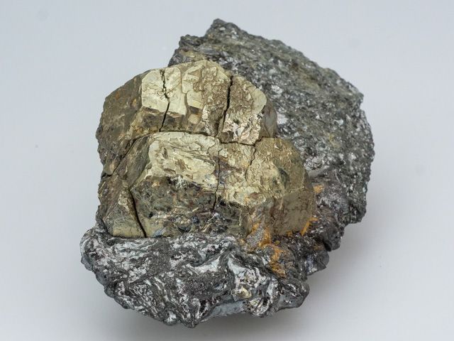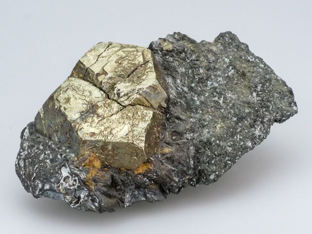 Krystal pyritu typicky zlaté barvy na podložce z hematitu. Krystal je přirozeně popraskaný a ve středové části mířně otřelý. Vzorek z klasické evropské lokality Rio Marina (Elba).