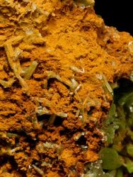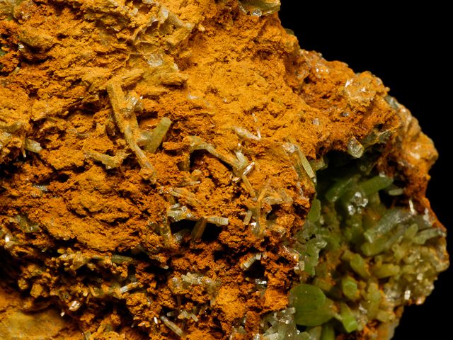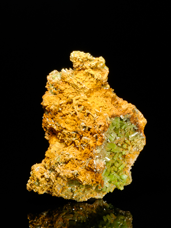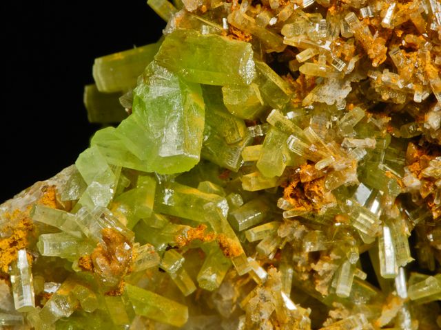 The finest contemporary green Pyromorphites on the market right now are those from the Daoping mine.The finest contemporary green Pyromorphites on the market right now are those from the Daoping mine. This section of the mine that produced these pieces is now closed and will never again produce these superb Pyromorphites. This specimen is a beautiful small cabinet consisting of dozens of stubby, lustrous, attractive yellow green color crystals on gossan matrix.