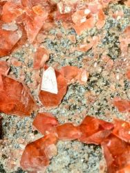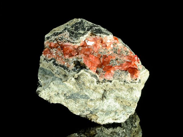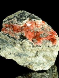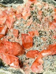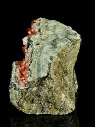 This medium size specimen hosts a few sharp, gemmy, red color scalenohedral crystals of Rhodochrosite measuring up to 11 mm long on matrix. A nice sample of this well known material from Uchucchacua mine in Peru.
