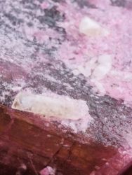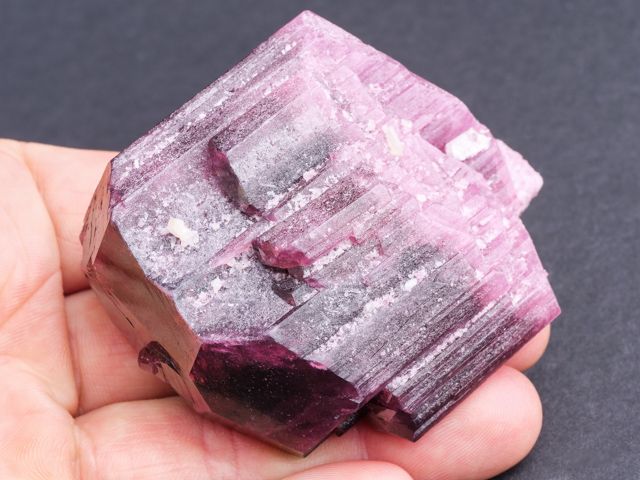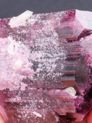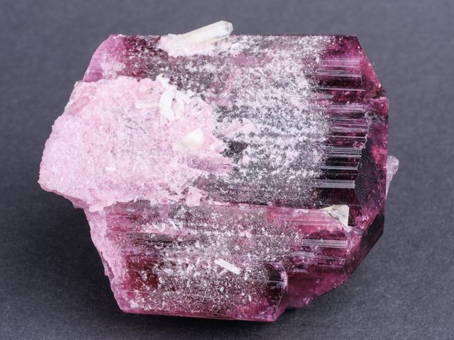 Classic lustrous Tourmaline from the Malkhan pegmatite field. Tourmaline crystal measuring to 6.7 cm display a deep pink colour. There are danburite crystals on the side. No damage.