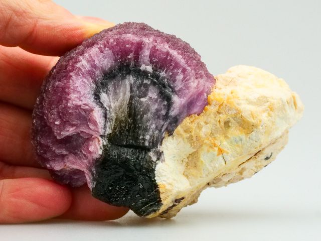 A really excellent mushroom tourmaline from Mogok. A translucent, dark raspberrry-red, trigonal tourmaline crystals with a schorl core. Tourmaline with a bright pink termination attached to matrix.