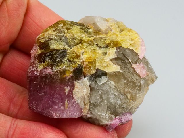Lustrous pink tourmaline crystal on smoky quartz crystal with white mica crystals. The rubellite is very lustrous and terminated. Termination is chipped.