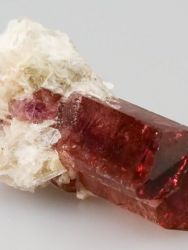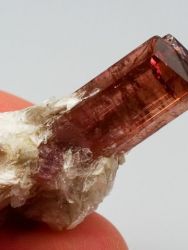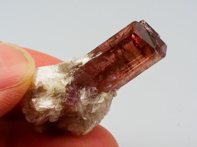 This gemmy, evenly-colored dark pink crystal is a classic color and style for the locality.This gemmy, evenly-colored dark pink crystal is a classic color and style for the locality. However, few truly killer thumbnails have come out compared to larger pieces, and to obtain one of this quality with some distinction or association (such as the mica associated), is quite difficult.