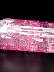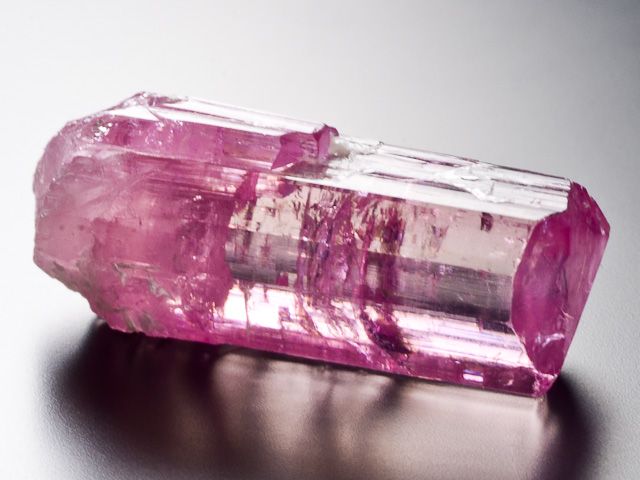 Krásný a estetický ukončený krystal rubelitu z famózní lokality Malkhan. Jedná se o turmalín elbaitové řady z pegmatitů Sibiře. Lesklý krystal velmi čistého rubelitu bez poškození. Kámen dosahuje v celém objemu horní třetiny top brousitelné suroviny. Velmi malý čip v jedné ploše ukončení - zanedbatelné poškození.