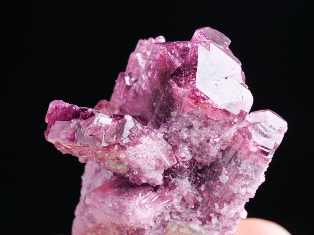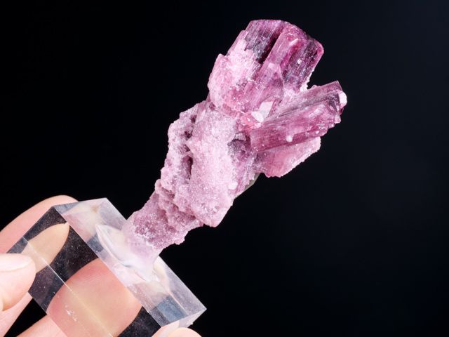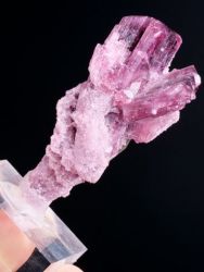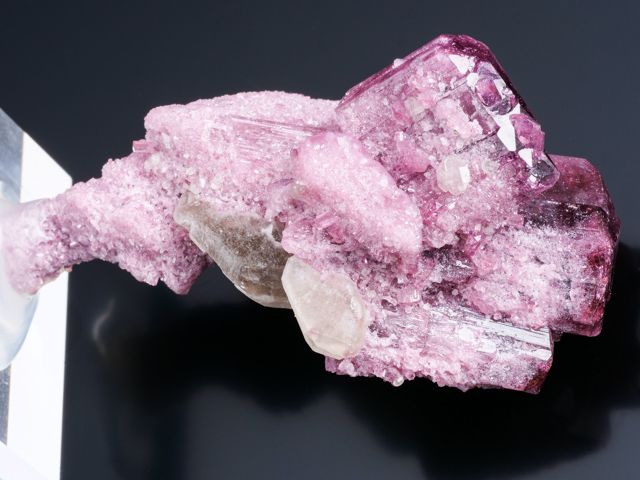 Pink tourmaline crystals on matrix with terminated smoky quartz crystal. The rubellites are very lustrous and terminated.