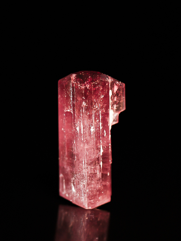 Pink double terminated tourmaline crystal from Malkhan pegmatite field. Superb for both the translucence and lustrous terminations on both ends. A sharp quartz crystal sits at the back side of tourmaline crystal.