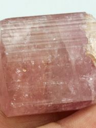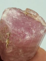 Ukončený krystal rubelitu z famózní lokality Malkhan. Jedná se o turmalín elbaitové řady z pegmatitů Sibiře. Lesklý krystal s nevýrazně lesklými hranami ukončení. Jen minimální setření hran. Kvality suroviny na broušení tzv. ruské "kabošonky".