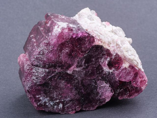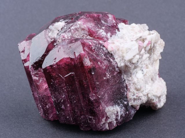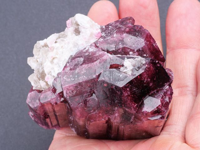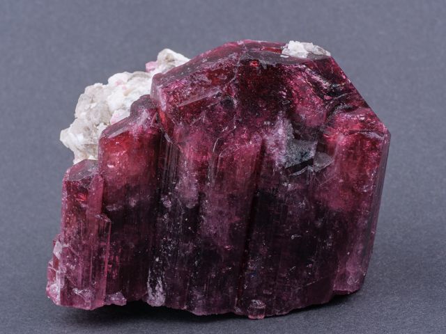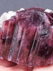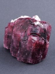 Hezký vzorek turmalínu - rubelitu z lokality Malkhan (pegmatit Sousedka). Tento 6,6 cm velký krystal sytě růžového turmalínu je ukončený a bez výrazného poškození (na vzorku je jen 7x5 mm drobné poškození hrany). Barevnost je odvislá od způsobu nasvícení. Na vzorku naleznete i několik malých krystalů záhnědy a živce.