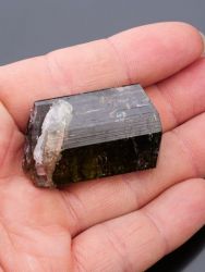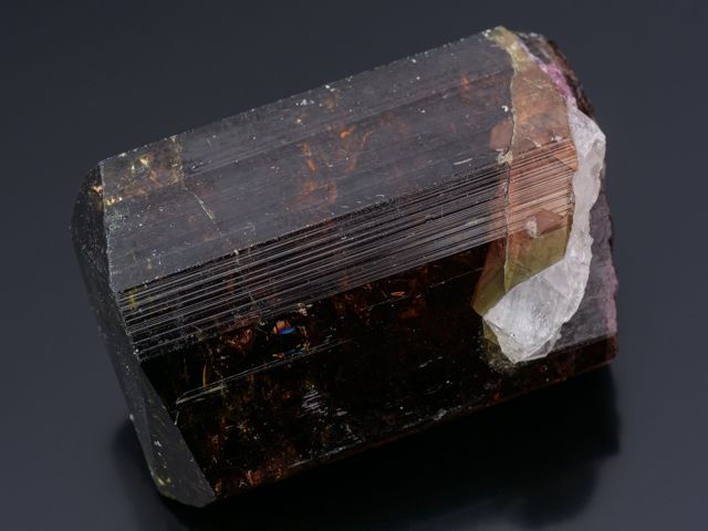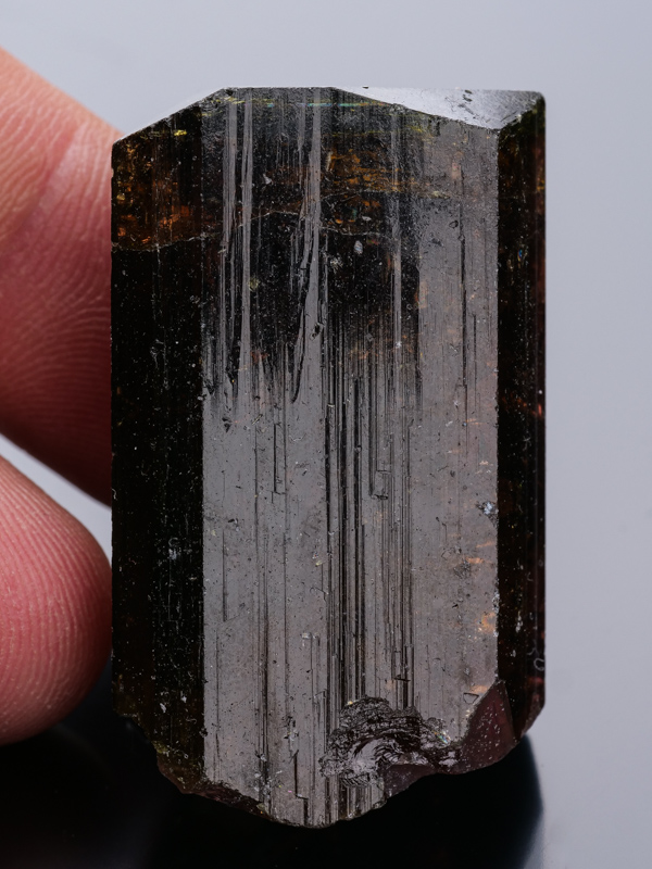 Krásný ukončený krystal lesklého rubelitu s narůstajícím krystalem živce. Super lesklý krystal příjemné hnědooranžové barvy (při otočení na polarizovaném světle se barva změní na hnědorudou). Super vzorek turmalínu z Madagaskaru do sbírky!