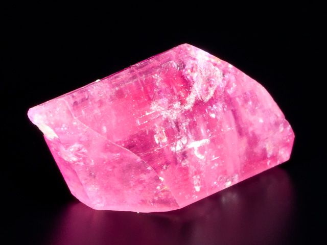 A very nice example of the doubly terminated tourmaline variety rubelitte from a find in 2013.A very nice example of the doubly terminated tourmaline variety rubelitte from a find in 2013. This one is almost pristine and has glassy lustre. Other tourmalines are pink, but few are this pink. It is complete all around, and very symmetrical.