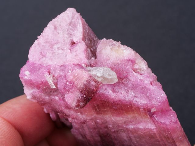 Hezký vzorek turmalínu - rubelitu z lokality Malkhan (pegmatit Sousedka). Tento 8,1 cm velký krystal sytě růžového turmalínu je ukončený a bez poškození. Barevnost je odvislá od způsobu nasvícení. V dolní části naleznete i malý krystal danburitu a záhnědy.