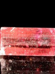 A very nice example of the tourmaline variety rubelitte from a find in 2014. This one is almost pristine and has glassy lustre. Other tourmalines are pink, but few are this pink. It is incomplete but very symmetrical. The crystal is not terminated, and very gemmy.