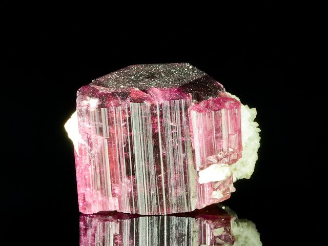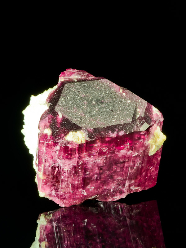 Krystal sytě růžového rubelitu o velikosti 4,7 cm z úžasné lokality Malkhan, Rusko.Krystal sytě růžového rubelitu o velikosti 4,7 cm s několika drobnými krystaly albitu vrůstající do hlavního krystalu. Kámen je lesklý, se sytě malinovou barvou a zajímavým ukončením. Na spodní části krystalu ve středové partii barva přechází do oranžovo žluté (krystal by se dal označit jako vodní meloun). Zajímavý kvalitní vzorek za rozumnou odpovídající cenu. Investiční kámen!