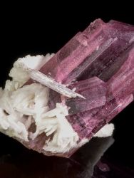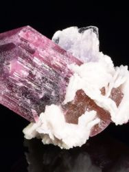 Krásný ukončený krystal rubelitu s drobnou slídovoalbitovou podložkou z famózní lokality Malkhan.Krásný ukončený krystal rubelitu s drobnou slídovoalbitovou podložkou z famózní lokality Malkhan. Jedná se o turmalín elbaitové řady z pegmatitů Sibiře. Lesklý krystal příjemné růžové barvy bez poškození. Krystal narůstá na skupinu lesklých krystalů slídy a albitů.