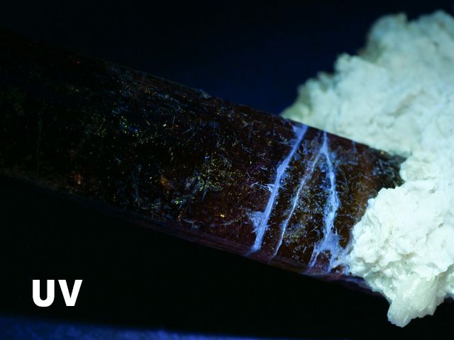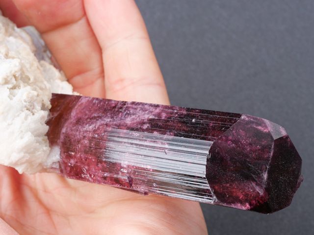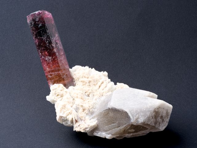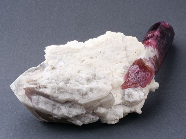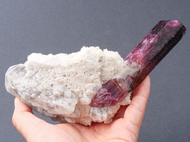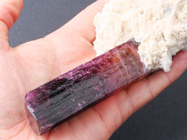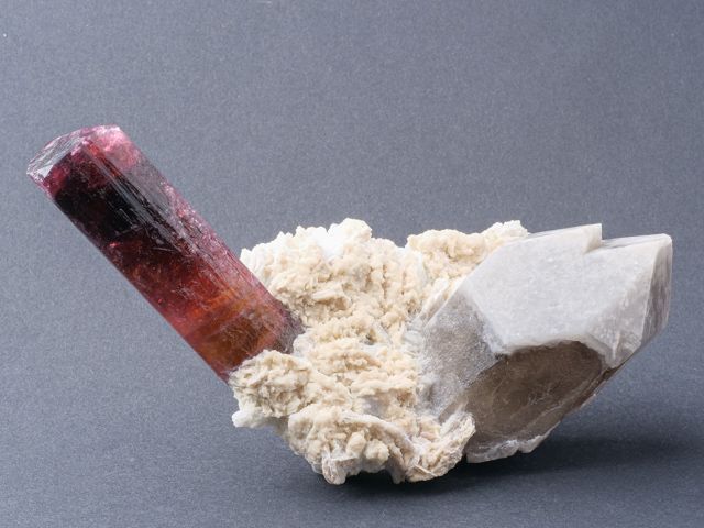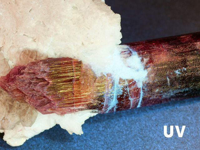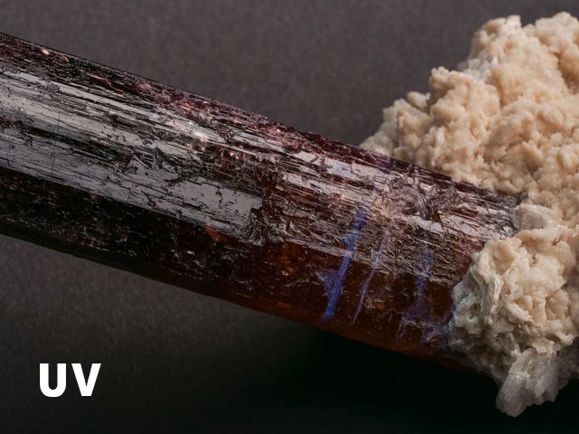 Krystal rubelitu na podložce z lokality Malkhan v Rusku. Hlavní krystal má velikost 11,6 cm a má oranžovočervenou barvu. Na vzorku naleznete i oboustranně ukončený krystal záhnědy (9,3 cm) a albity pokryté zeolity. Vzorek bez poškození. Hlavní krystal byl z podložky odlomen při těžbě a profesionálně dolepen zpět. Rozsah opravy naleznete na posledních fotkách s označením UV (pořízeny pod osvětlením UV světla).