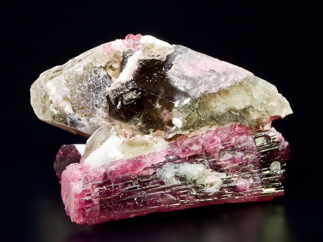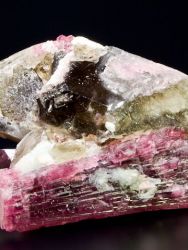Velmi kvalitní vzorek ukončených krystalů turmalínu na oboustranném křemeni z lokality Malkhan. Až 98 mm velké krystaly rubelitu na ukončeném krystalu křemene (varianta záhnědy). Na vzorku je i několik malých krystalů živců. Kámen s třemi opravami a jednou drobnou rekonstrukcí turmalínu (laboratoř Federica Pezzotty). Vhodný i jako investice - kameny z lokality Malkhan cenově rostou rok od roku strmě vzhůru.