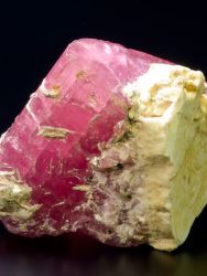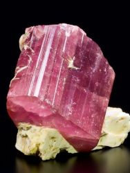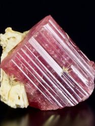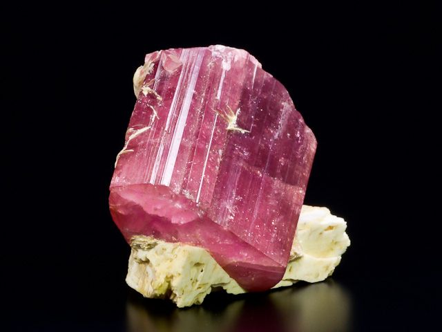 Classic lustrous Tourmaline on Feldspar from the Malkhan pegmatite field. The translucent Tourmaline crystal measuring to 3.6 cm displays a deep pink colour. No damage.