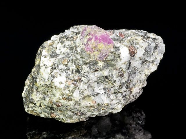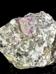 Pěkná ukázka do fialova zabarveného krystalu rubínu z ruské lokality na poloostrově Kola.Pěkná ukázka do fialova zabarveného krystalu rubínu z ruské lokality na poloostrově Kola. Samotný krystal, který je obklopen malými krystaly biotitu a zrny rubínu měří 12x10x9 mm. Nepoškozený vzorek.