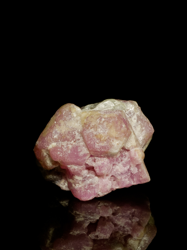 Complex cluster of pink corundum crystals fully crystallized on all sides (with only small point of attachment). There is mica embedded on the front side, and the back side is where it was attached to massive Corundum.