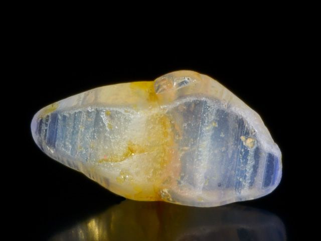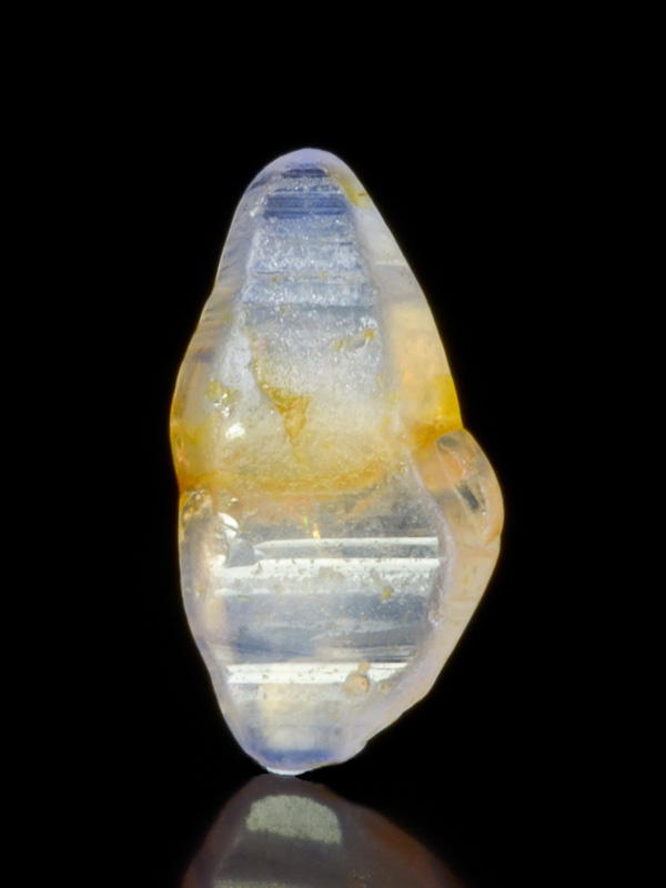 Světle modrožlutý vřetenovitý krystal safíru z lokality Ratnapura. Skvěle tvarovaný krystal (částečně zploštělý) s dobrým leskem, zajímavou zonálností a místy drahokamovou čistotou. Krystal je bez poškození a je vhodný nejen do sbírky drahokamových minerálů, ale i jako přírodní drahokam do šperku.