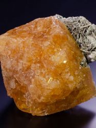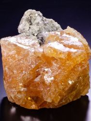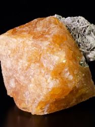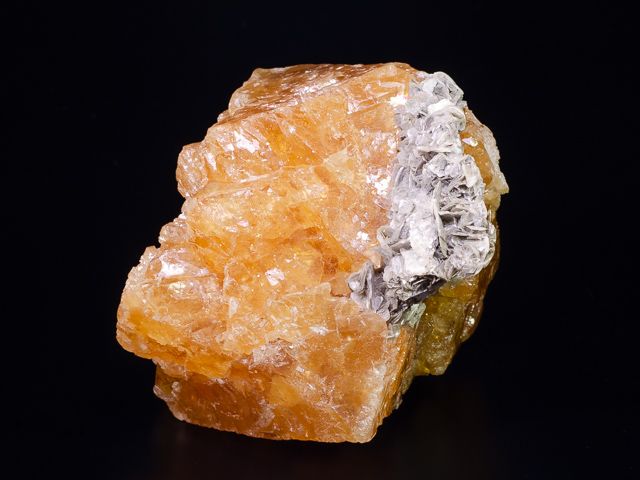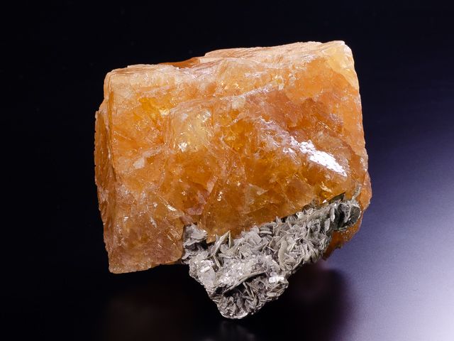 Rich orange, lustrous scheelite, 5.3 x 5.3 cm on the edges contacting matrix and up to 7.9 cm along pyramidal edge.Rich orange, lustrous scheelite, 5.3 x 5.3 cm on the edges contacting matrix and up to 7.9 cm along pyramidal edge. Muscovite crystals envelop the scheelite on one side and the specimen is in top condition. Prior to the discovery of the Chinese scheelites, orange crystals of this size an magnitude were incredibly rare.