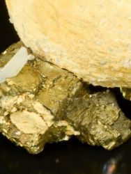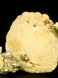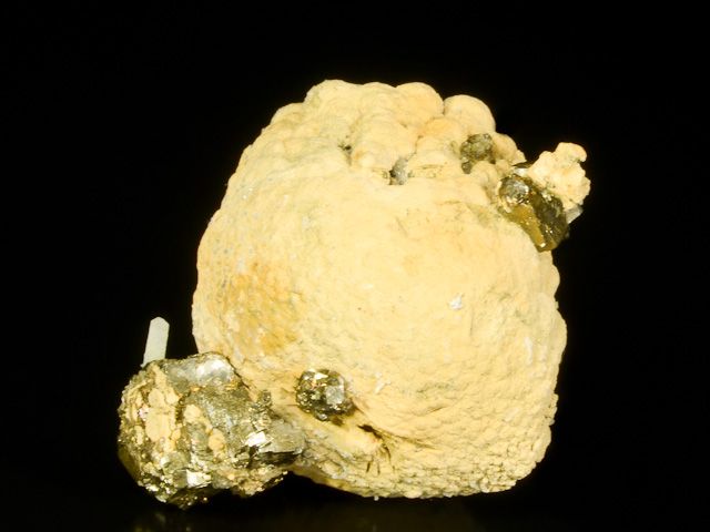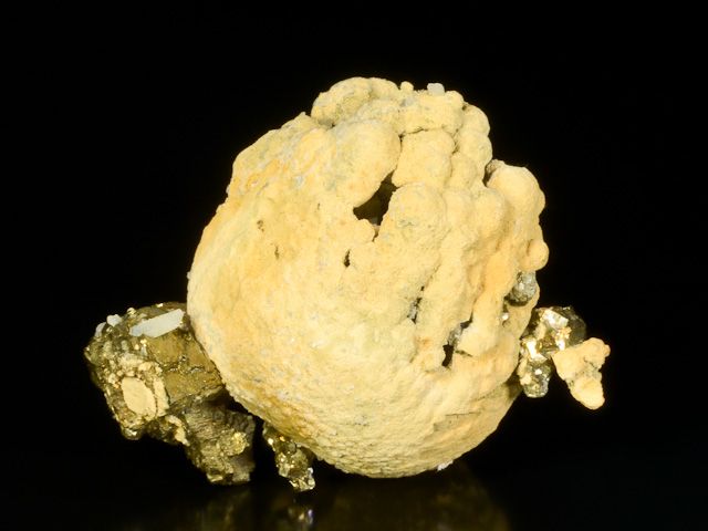 Překrásná ukázka sférické koule sideritu na kterém jsou lesklé, mléčně zbarvené krystaly kalcitu do velikosti 2,5 mm a krystaly pyritu o velikosti do 6 mm. Má pouze drobné místo původního připojení na horninu, jinak je vzorek plovákem. Jedná se o klasický materiál z této famozní lokality.