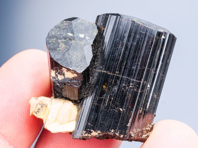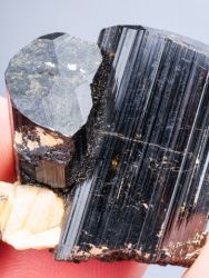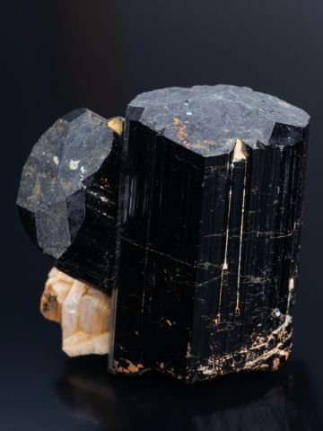 Dark-black/brown Schorl crystals on small albite matrix. The tourmaline crystals have lustrous crystal faces. 1 repaire - smaller crystal.