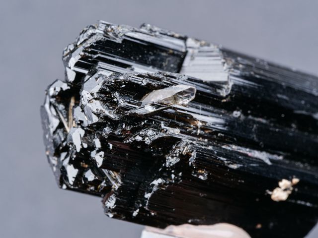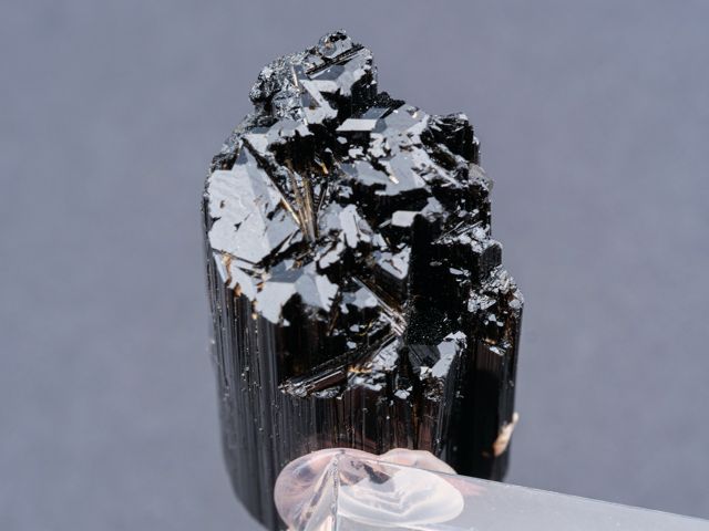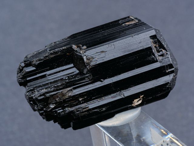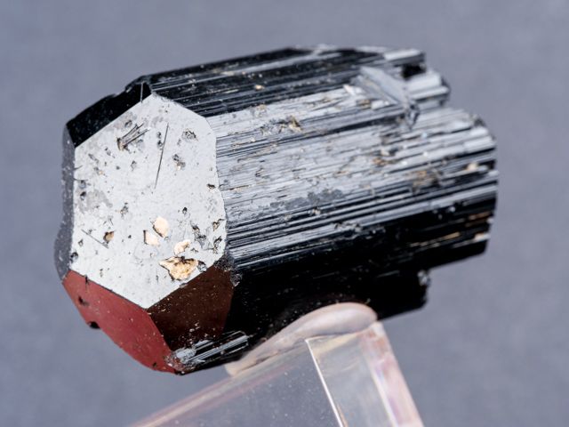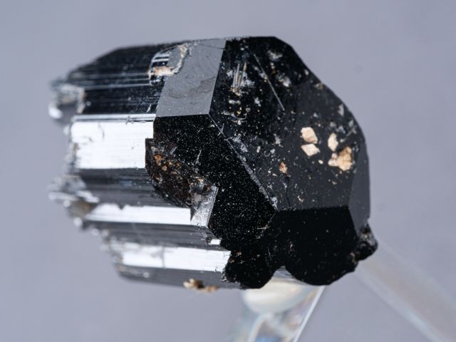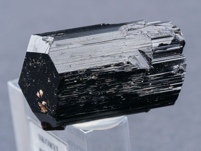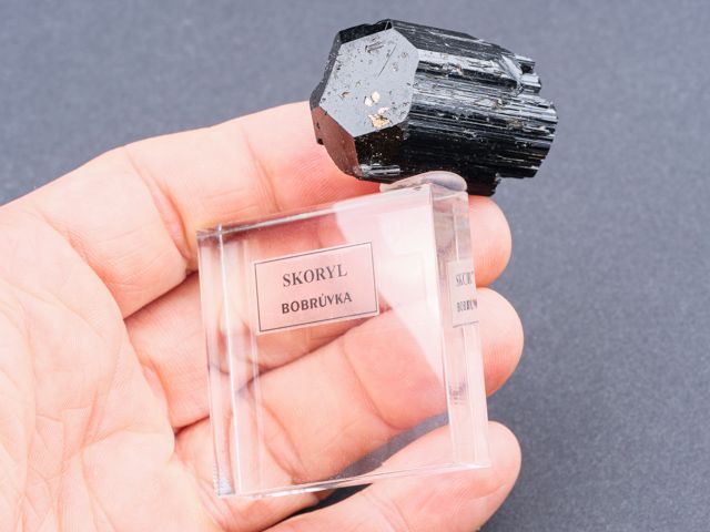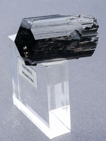Krásný oboustranně ukončený krystal skorylu z lokality Bobrůvka. Jedná se o turmalín černé barvy. Kámen má vysoký lesk a malý krystal záhnědy po straně. Vzorek je dodáván i s podstavcem.