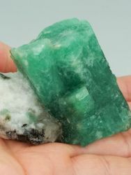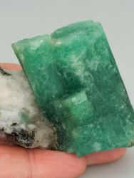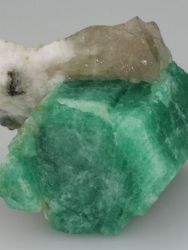 Prismatic emerald crystal of very well-defined faces and edges, of uniform color and esthetically situated on the Quartz and Feldspar matrix.Prismatic crystal of very well-defined faces and edges, of uniform color and esthetically situated on the Quartz and Feldspar matrix. It is from an uncommon Madagascar locality.