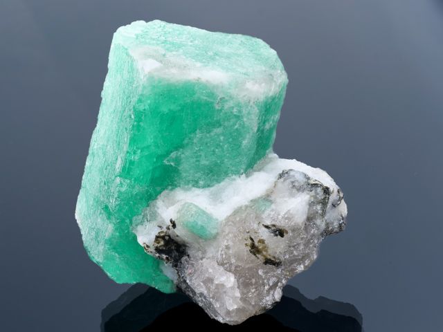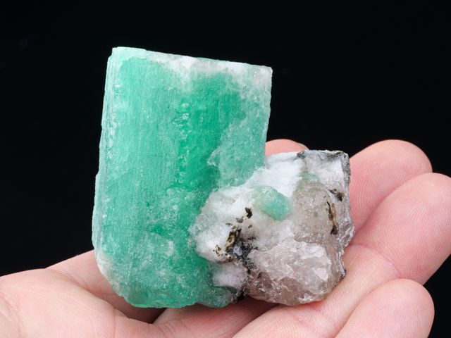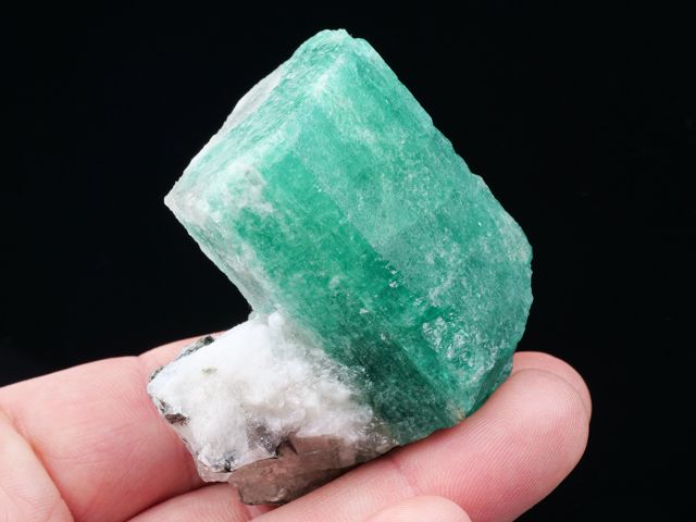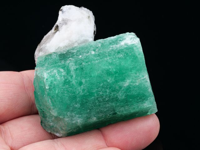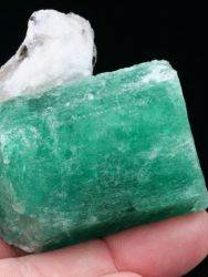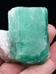 Překrásná ukázka smaragdu na podložce křemene a živce z Madagaskaru. Vzorky smaragdů z této lokality nebývají příliš efektní a zajímavé, ale zde se jedná o nadstandardní kámen s velmi sytou barvou. Zde se jedná o estetický kámen, kdy hlavní krystal berylu měří 5,0x3,5x2,4 cm.