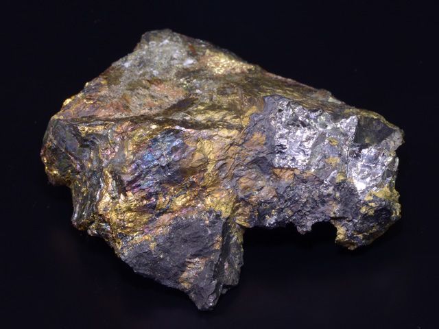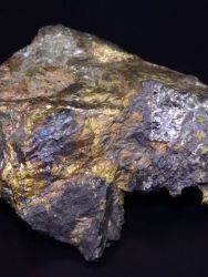 This is a spectacular display-quality piece with good aesthetics. The contrast of colors, between the brassy matrix of massive chalcopyrite and the mirror bright luster, and silver color of sperrylite, is spectacular. Sperrylite crystal is 17 mm across and it is very sharply crysatllized. Sperrylite is one of the world's great platinum minerals in crystalline form and specimens of quality, and of size, came only from a small deposit found here some years ago. Now, they are very scarce on the market.