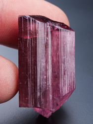Unusually large lustrous transparent dark-red spessartine garnet crystal with surfaces composed of many parallel, stepped crystal faces on all sides.Unusually large lustrous transparent dark-red spessartine garnet crystal with surfaces composed of many parallel, stepped crystal faces on all sides. The spessartine shows gemmy transparency when illuminated from the rear. Most crystal faces are clean and undamaged. Weight: 43.4 grams.