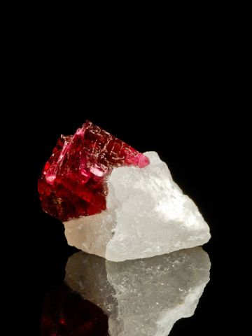 A sharp, lustrous and large, 14 mm magenta spinel octohedron nicely set on the face of a white calcite cleavage from Mogok.A sharp, lustrous and large, 14 mm magenta spinel octohedron nicely set on the face of a white calcite cleavage from Mogok, Myanmar. It does have an incomplete basal pyramid and some edge wear but for what it is, and the low price, its pretty darned impressive (especially for Myanmar/Burma where they don't generally get so large).