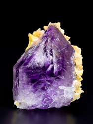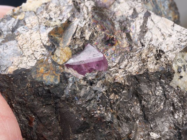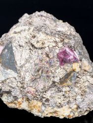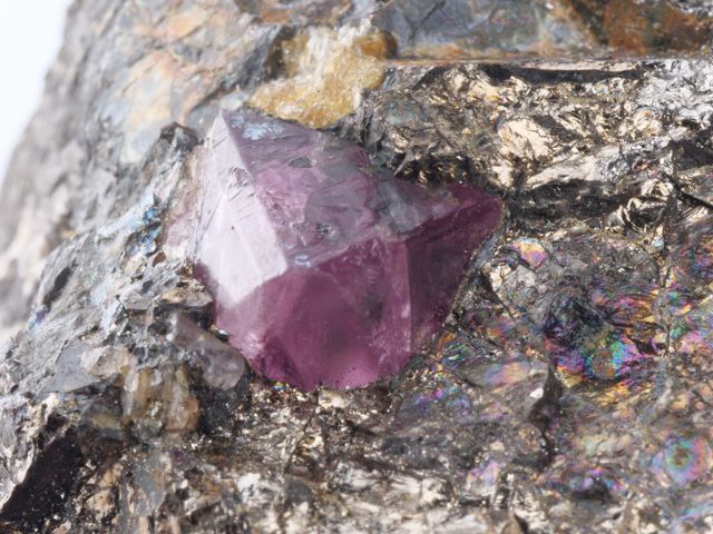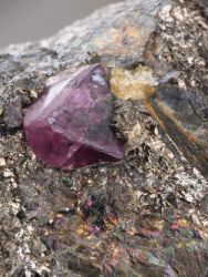 A superb single 9 mm gem crystal atop a perch of massive pyrrhotite, from the old find in Tajikistane.A superb single 9 mm gem crystal atop a perch of massive pyrrhotite, from the old find in Tajikistane. There is 1 other spinel crystal on the matrix. I had never seen spinel on pyrrhotite (or other sulfides) from anywhere. These gem crystals have a unique lavender hue that sets them apart from other spinels we have seen out of Mogok and Sri Lanka. Amazing color under UV light.