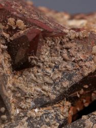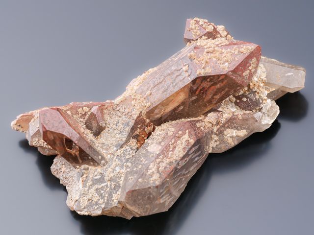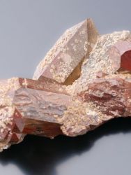 Rare and highly prized is Stolzite, which sits atop a light gray, translucent quartz with sheelite crystals.Rare and highly prized is Stolzite, which sits atop a light gray, translucent quartz with sheelite crystals. It is an orange-brown color which is sharply angular in shape and earthy in luster. This piece was mined from the Ore Mountains in a tin deposit located in both Cinovec , Czech Republic and Saxony Germany.